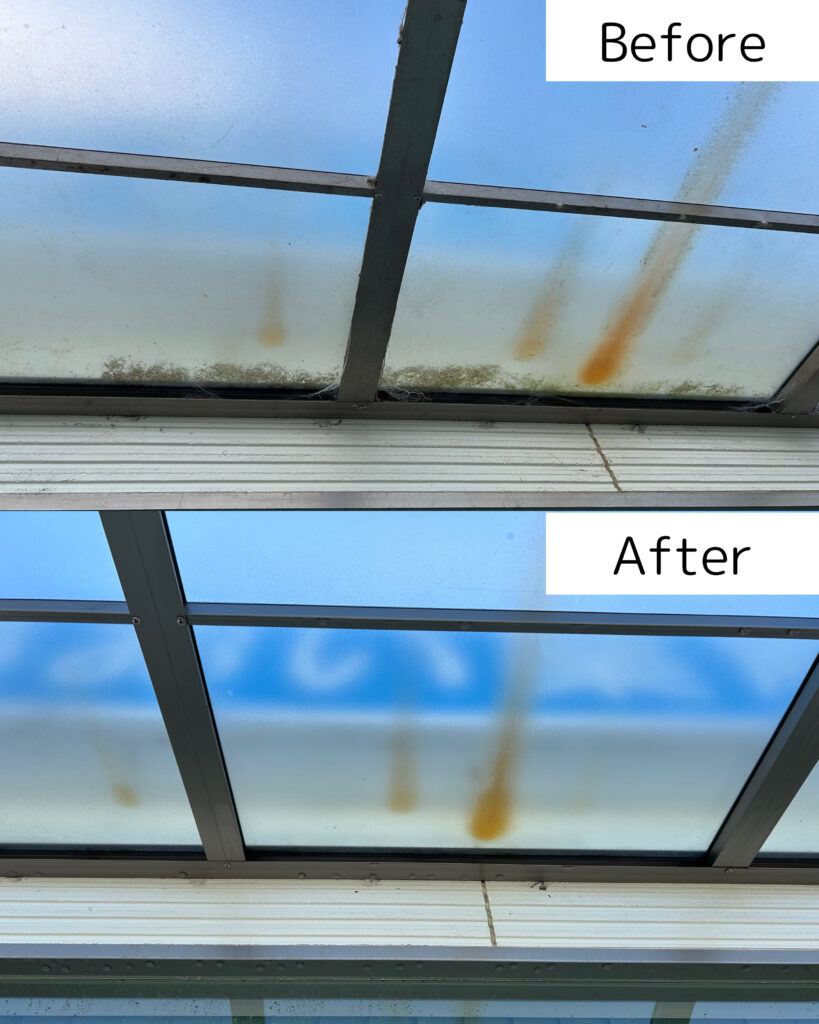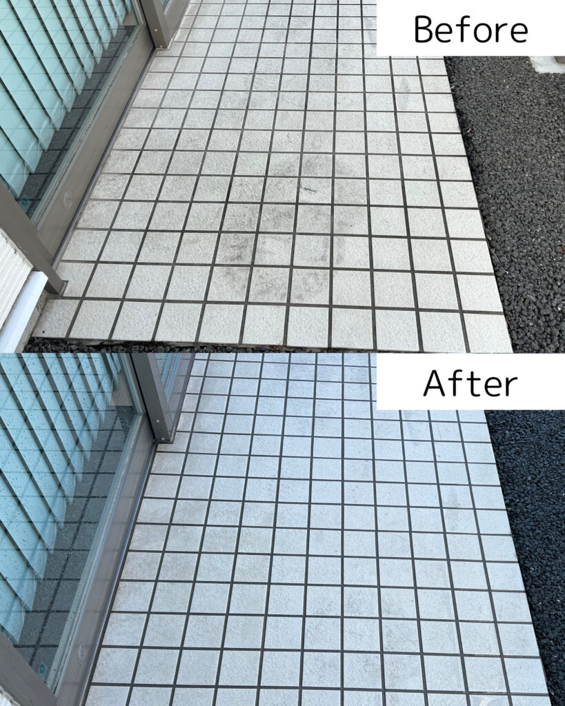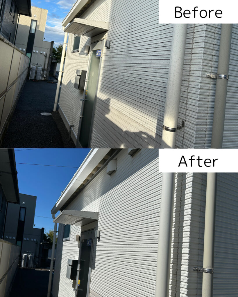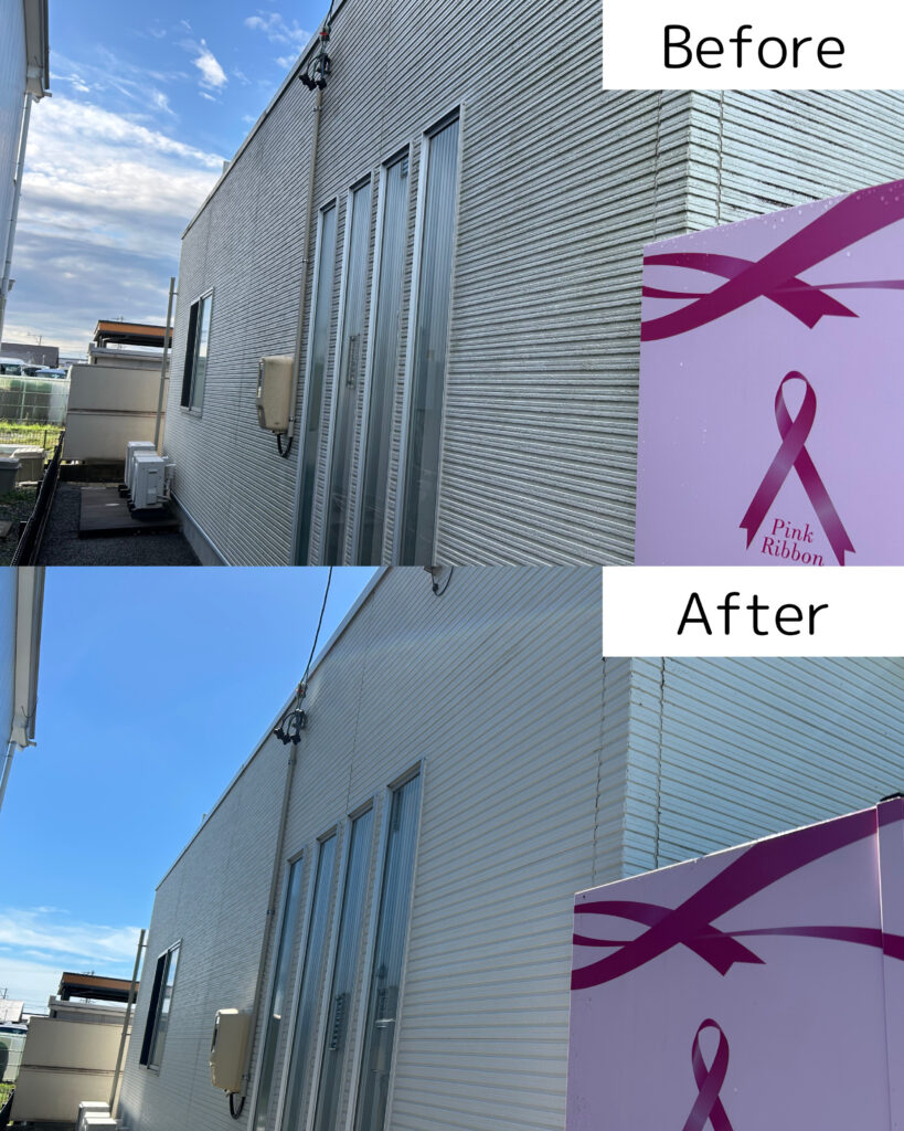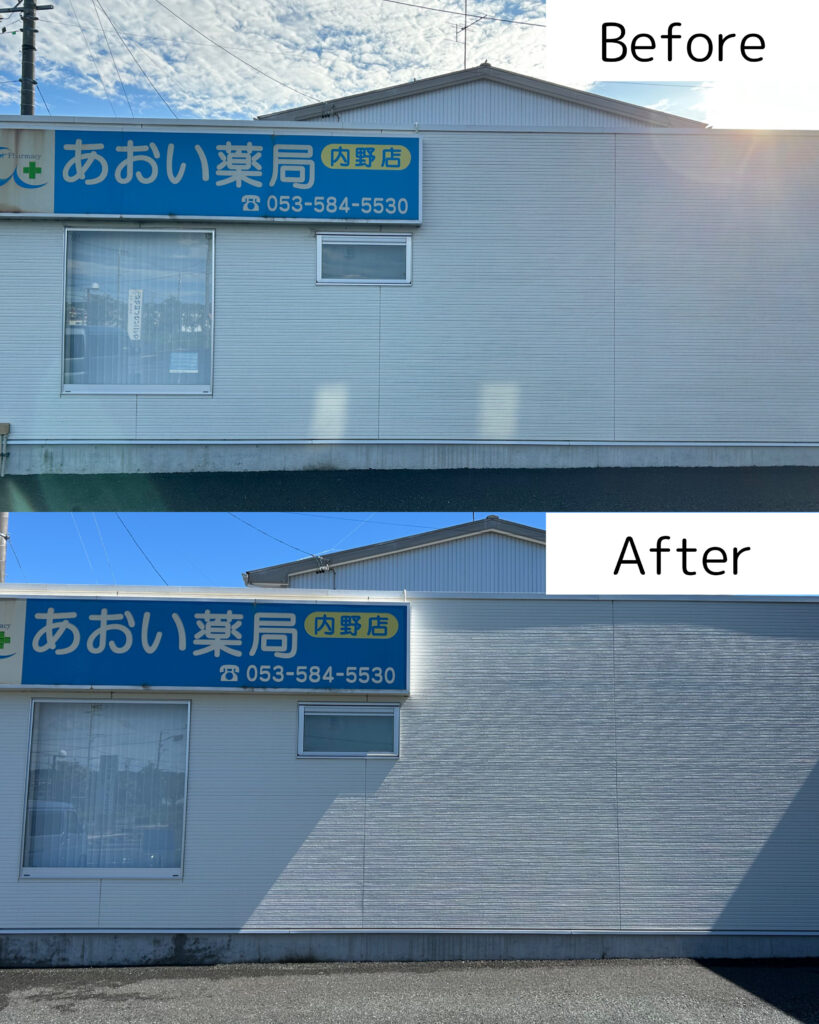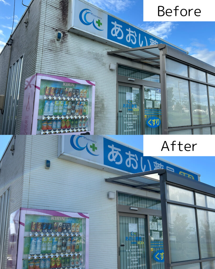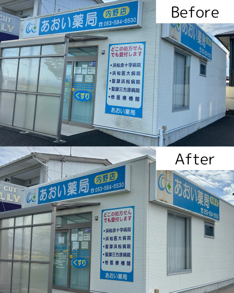 浜松市浜名区内野にある薬局「あおい薬局 内野店」さんより外壁洗浄のご依頼いただきました。全体的に外壁の汚れが気になるとのことで、全面の洗浄をさせていただきました。特に正面は写真で見比べるとかなり綺麗になりました。入り口のタイルと風除室のパネルも一緒に洗浄し、薬局全体が綺麗になりました。