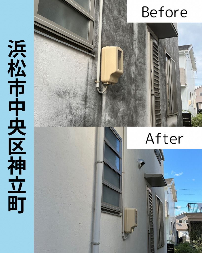 漆喰壁の汚れはサイディング材と比べかなり汚れが落ちにくく、苦戦しましたが、最終的には外壁本来の色である白い外壁が蘇りました。漆喰壁や塗り壁などは汚れが染み付く前に洗浄することで、景観を綺麗に保つことができますので、汚れが目立ってきたと感じたら一度ご相談ください。